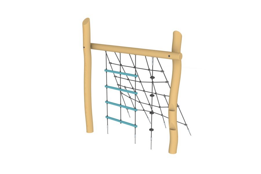 Игровое оборудование со скалодромом на деревянных стойках.